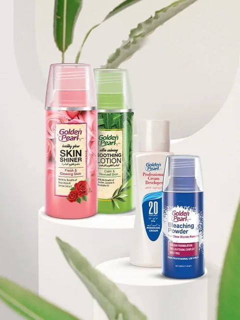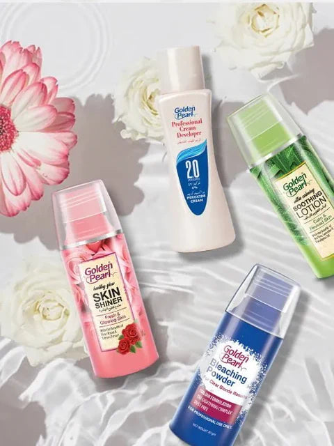 Add an equal amount of Golden Pearl Bleaching Powder, Golden Pearl Professional Cream Developer, Golden Pearl Ultra Calming Soothing Lotion and Healthy Glow Skin Shiner in a non-metallic bowl. Mix until a smooth paste is formed. Apply a thin layer on the face and parts of the neck and leave for 12 to 15 mins. For sensitive areas (upper lips, cheeks & nose) remove after 7 mins. Wash thoroughly with warm water or wipe away with a wet sponge. ☑ Suitable for all ages and skin types.